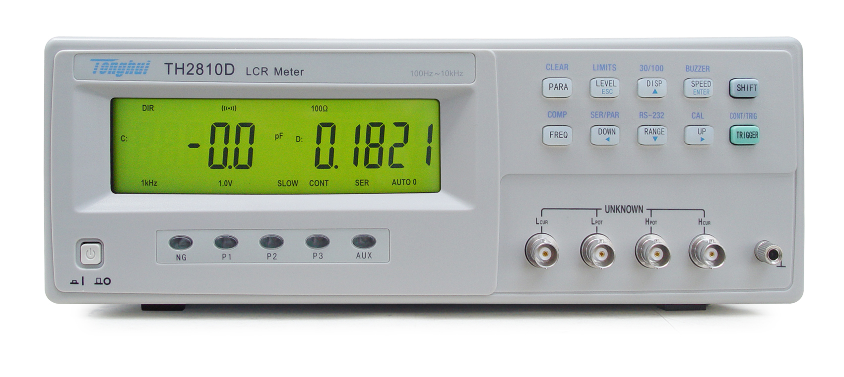 ■?TH2810D型LCR數(shù)字電橋是本公司最新研制的低頻元件測量的換代產(chǎn)品, 其中應用多項元件測量的最新技術,大字符LCD顯示,采用SMT貼片工藝,操作方便,外形美觀??蓾M足生產(chǎn)線質量保證、進貨檢驗及自動化生產(chǎn)的需要。?TH2810D為常州同惠最新推出的一款低價LCR數(shù)字電橋,在夾具方面采用了TH26004-1四端開爾文測試電纜加TH26001A?四端測試夾具以及短路片,精度為0.1%,內阻30/100歐姆。此外還有豐富的接口,RS-232和HANDLER接口等,可以連接電腦通訊及自動化測試。