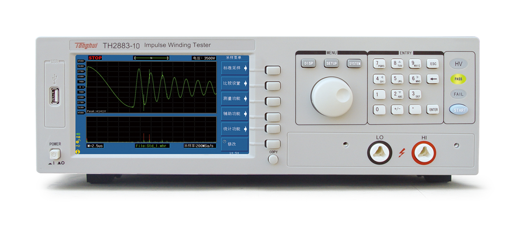 ? 沖電壓,是測試各種線圈的標配產(chǎn)品。TH2883-10具有最高10kV的脈沖 輸出電壓,可測試更高絕緣耐壓的匝間測試。
