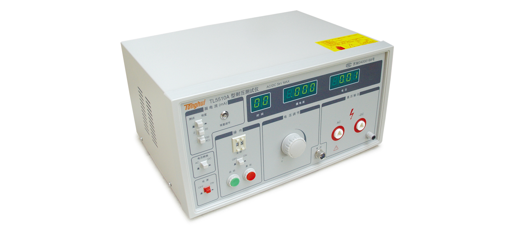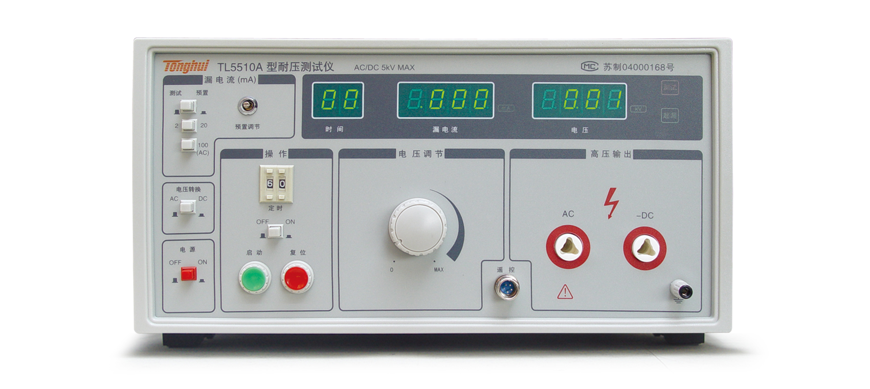 TL5510A 交流耐壓測試儀簡介■?TL系列耐電壓測試儀是按照《JJG795-2004耐電壓測試儀檢定規(guī)程》設(shè)計(jì)而成的,具有使用方便,性能穩(wěn)定等特點(diǎn)。應(yīng)用技術(shù)參數(shù)型號輸出電壓漏電流范圍準(zhǔn)確度測試時間TL5502B0-5kV(AC)0-2/20mA(AC )±(5%+3counts)1`-99sTL5502A0-5 kV (AC/DC)0-2/20mA(AC/DC )TL5510A0-5 kV (