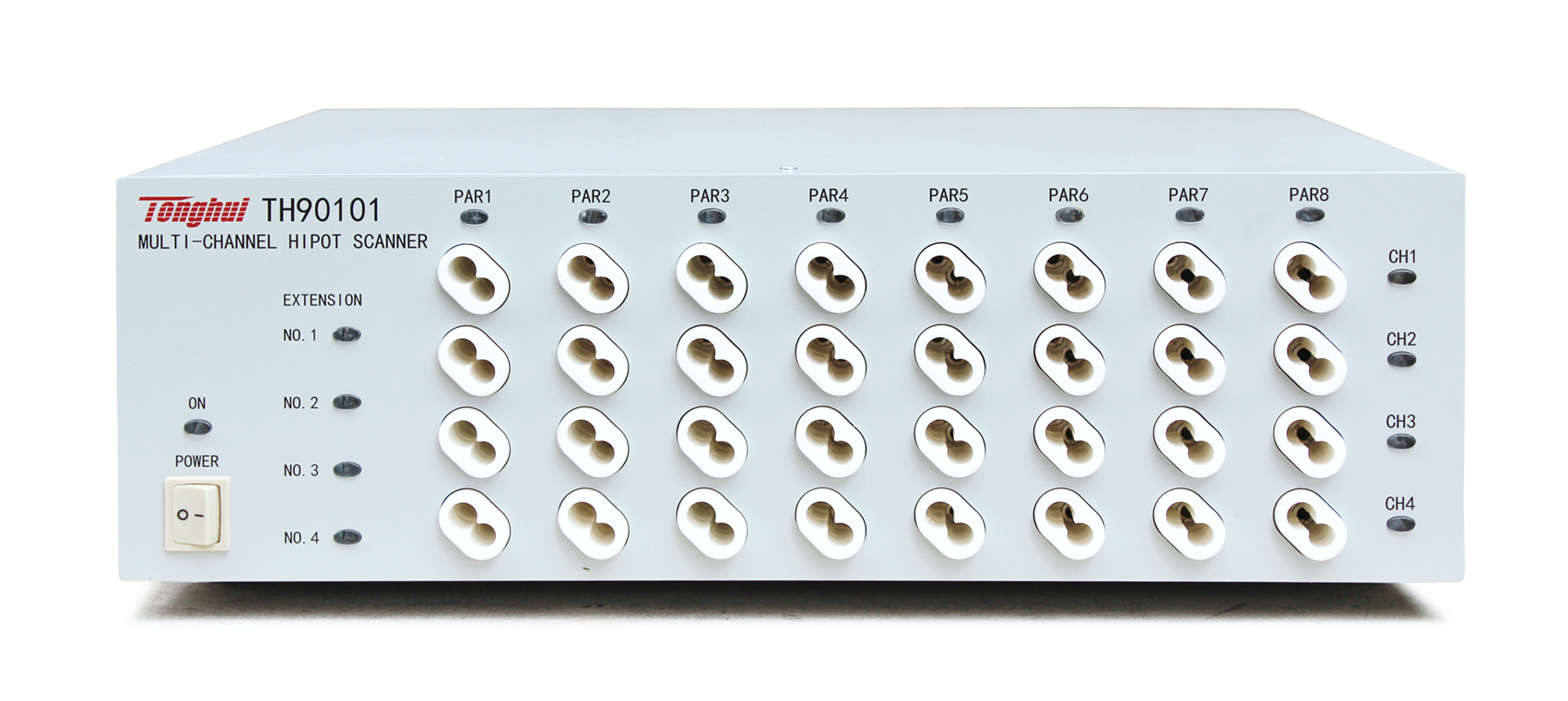 同惠TH90101 多通道高壓掃描器8*4擴展,將TH9010每單元擴展成4通道;TH9010最大支持四個四通道掃描器,一臺儀器可以拓展至128通道;四同掃描器支持接觸檢查功能同惠TH90101 多通道高壓掃描器