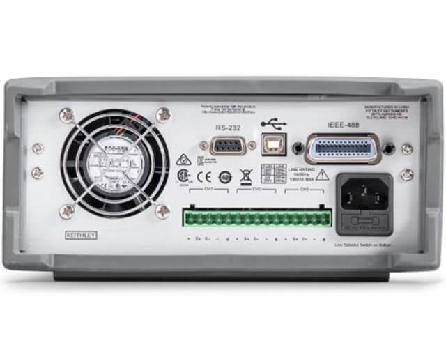 Series 2230G 電源后面板,顯示了 USB、GPIB 和 RS-232 接口和 后面輸出、來源及全部三條通道的傳感線端子塊