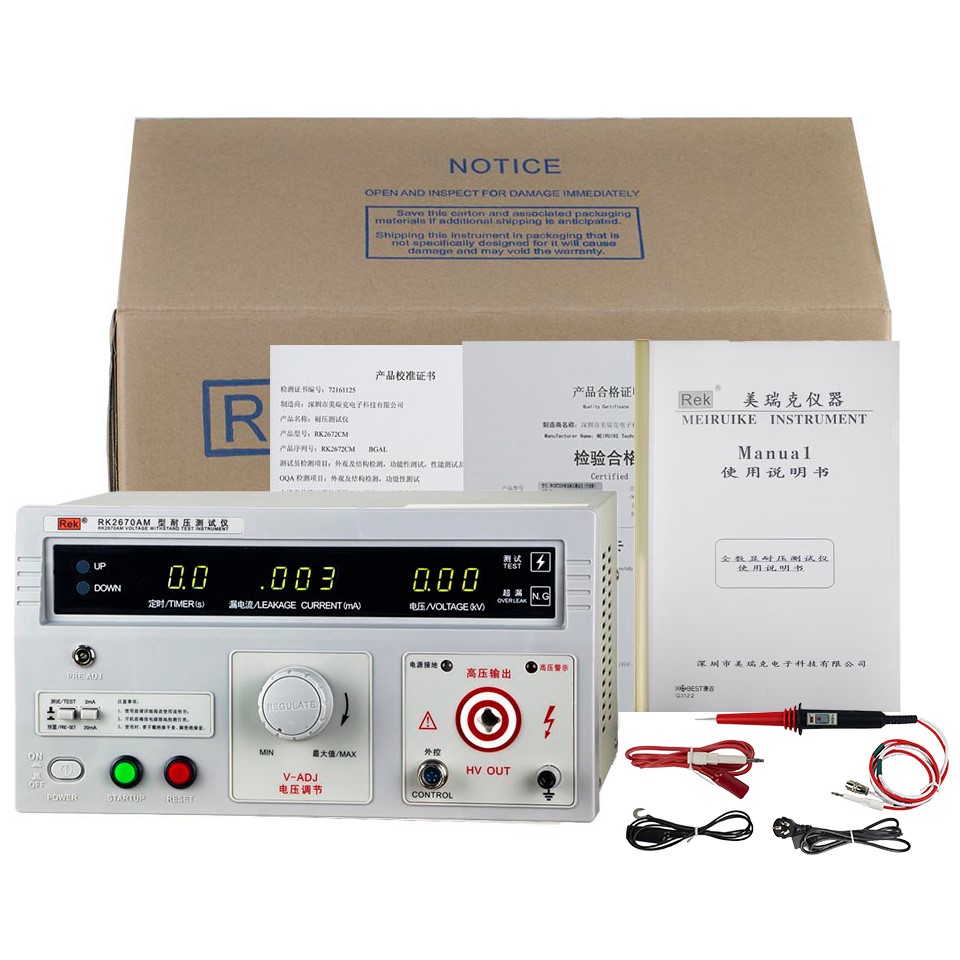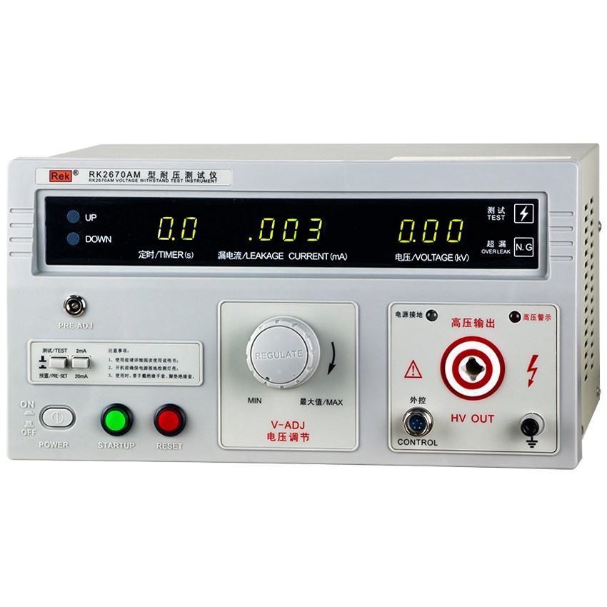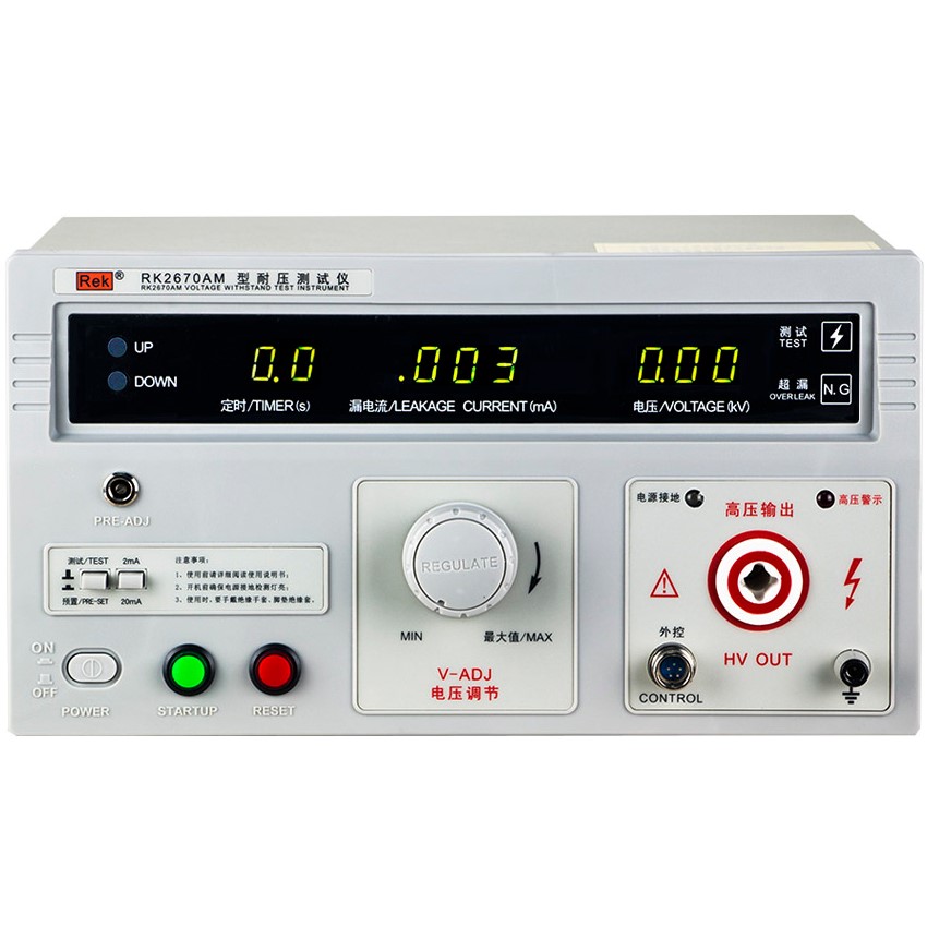 美瑞克RK2670AM型耐壓測試儀是測量耐壓強度的儀器,可以直觀、準(zhǔn)確、快速地測試各種被測對象的擊穿電壓、漏電流等電氣安全性能指標(biāo),并可以作為高壓源用來測試元器件和整機性能。