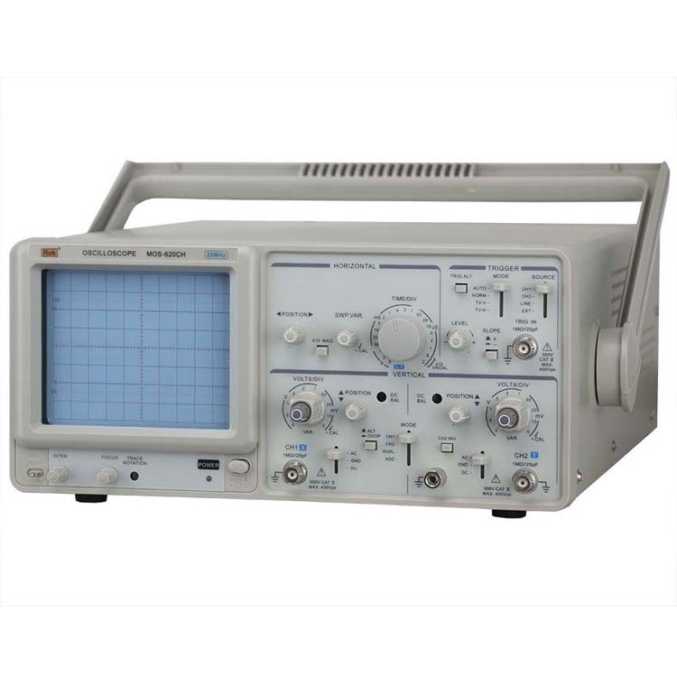 MOS-620系列雙蹤示波器,最大靈敏度位1mA/div,最大掃描速度為0.2us/div,并可擴(kuò)展10倍使掃描速度達(dá)到20ns/div。該示波器采用6英時(shí)并帶有刻度的矩形CRT,操作簡單,穩(wěn)定可靠。